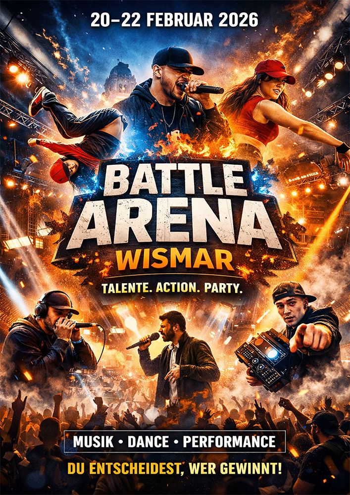 Die Battle Arena bietet jungen Menschen aus Wismar und der Region eine Plattform, um ihr Können zu zeigen, sich zu vernetzen und gemeinsam die lokale Szene zu feiern. Im Mittelpunkt stehen energiegeladene Battles auf der Bühne, begleitet von Live-Acts und DJs. Abseits des Wettbewerbs lädt eine Chillout-Area zum Austausch, Verweilen sowie zum gemeinsamen Ausklang des Abends bei Snacks und Getränken ein.