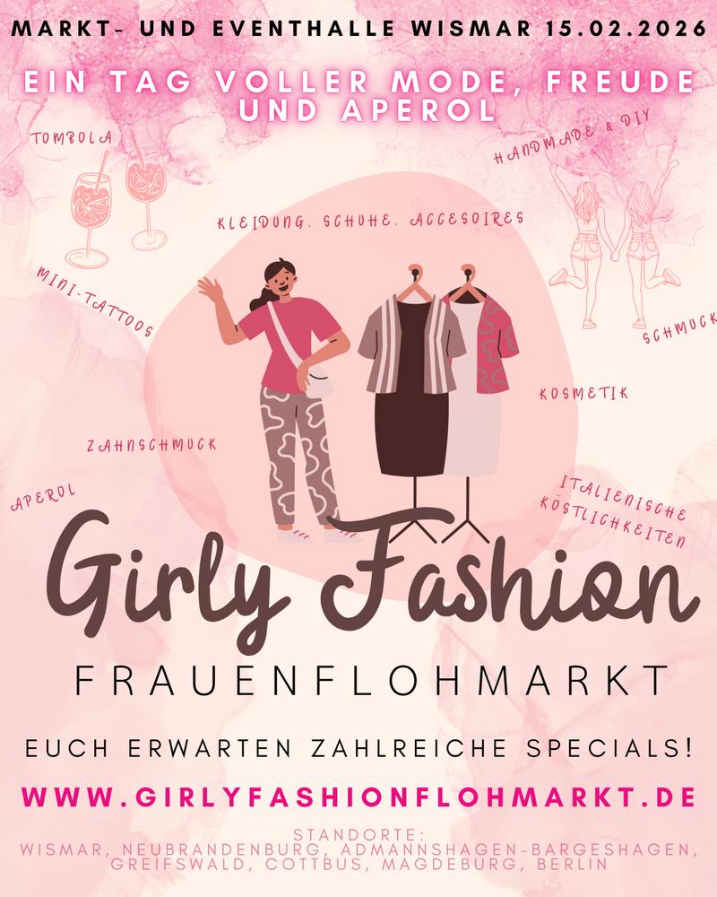 Was: Girly Fashion Flohmarkt — erster Markt in Wismar Wann: 15.02.2026, Einlass: 11:00 Uhr, Ende: 17:00 Uhr (Einlasszeiten und Programm ggf. auf der Webseite prüfen) Wo: Markt- und Eventhalle Wismar, Stockholmer Str. 1, 23966 Wismar | Website: https://www.girlyfashionflohmarkt.de